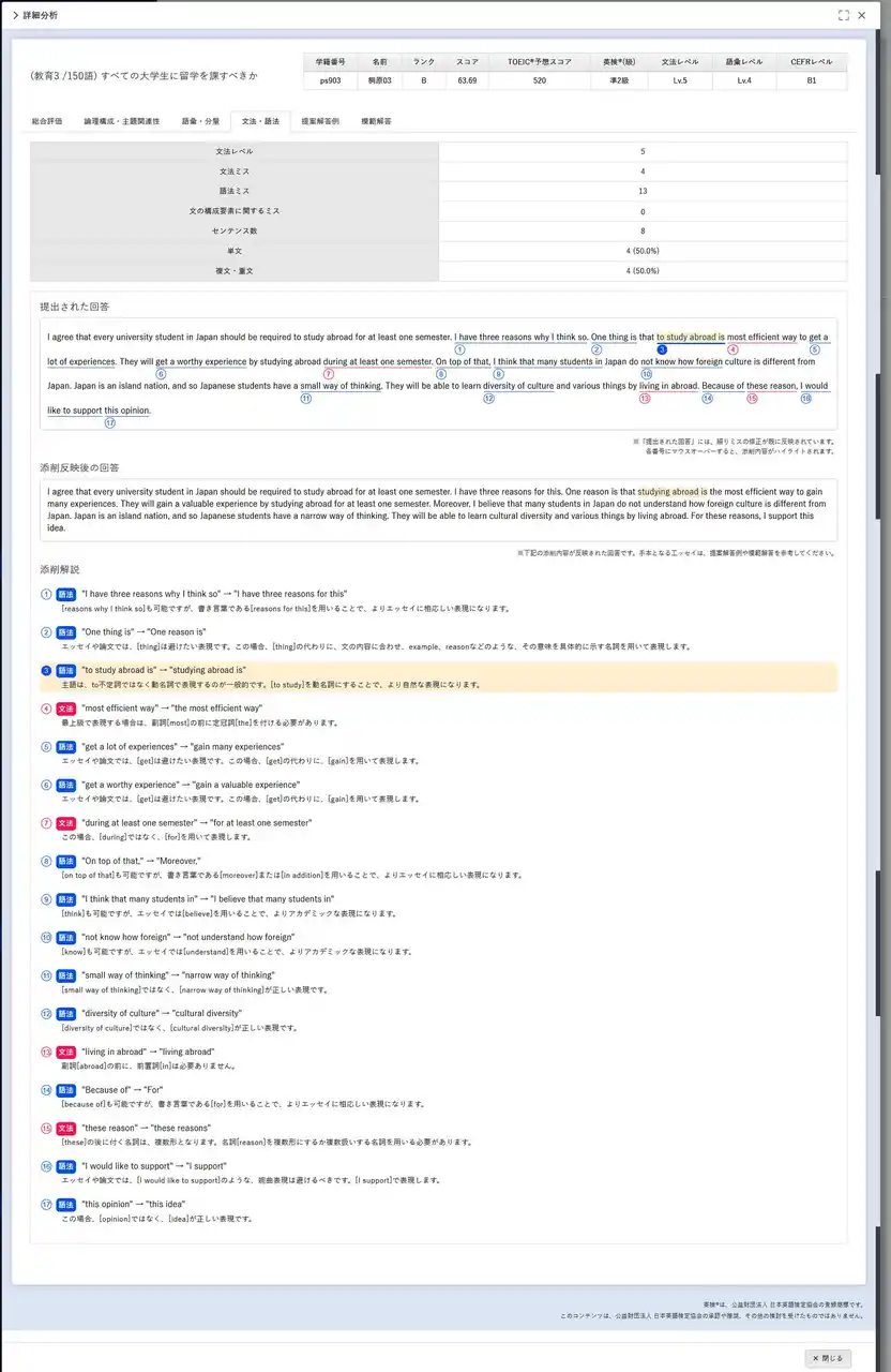 論理構成・分量・語彙・文法といった複数の評価項目について答案の英文を客観的に分析し、一貫した評価基準に基づくスコアを提示します。 |