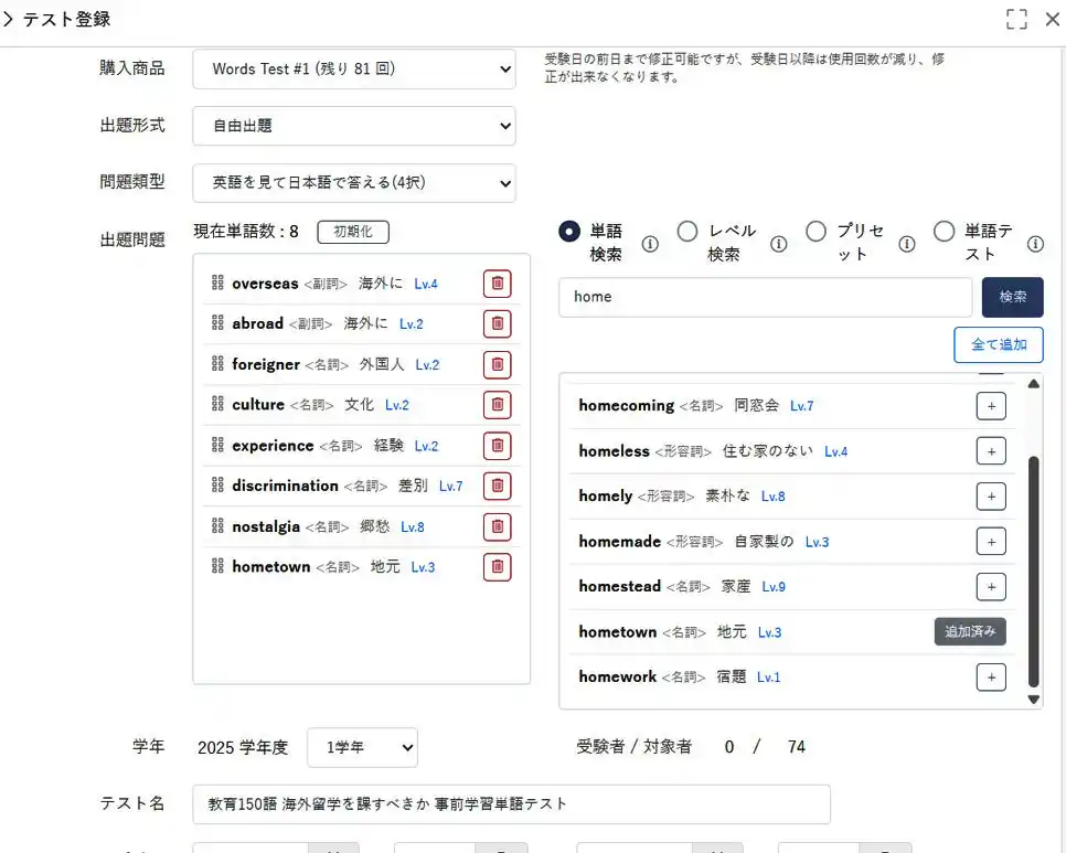 LMS上で単語テストを配信できる機能を搭載しました。 |