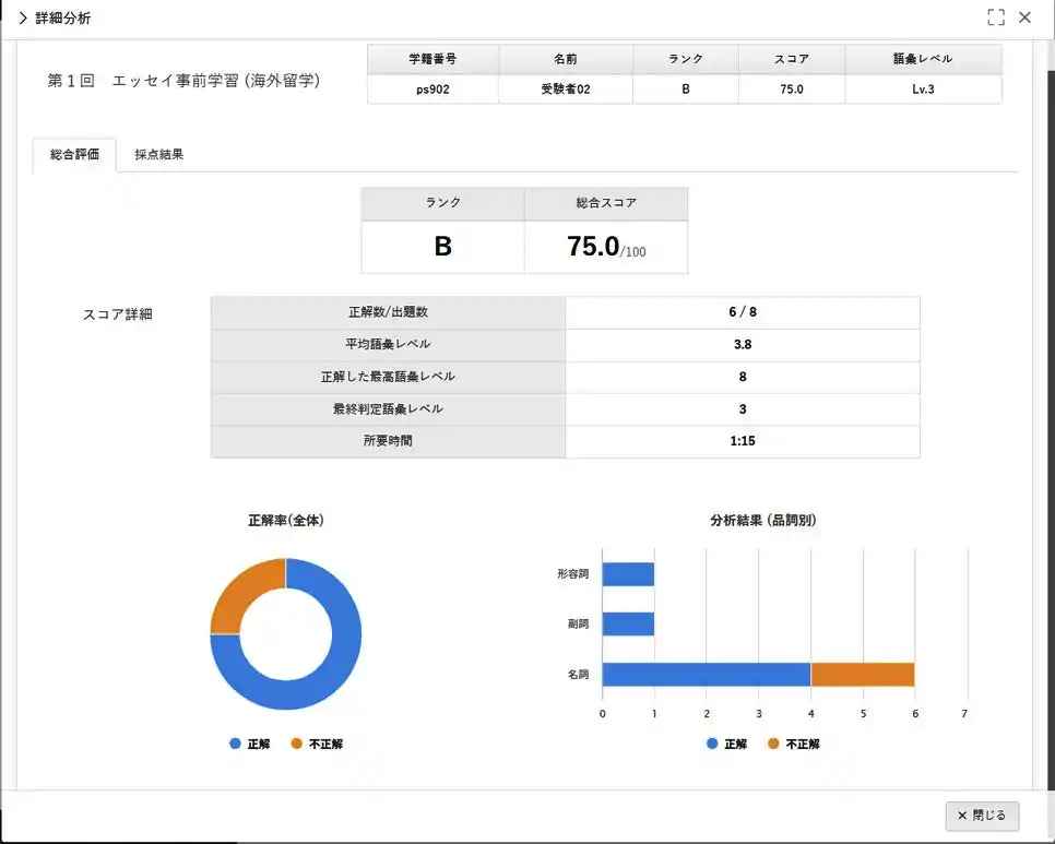 ▲総合評価画面:総合スコアおよび4項目(論理構成・分量・語彙・文法)のスコアを表示 |
