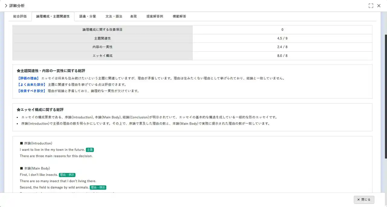 ▲よくできた部分、改善すべき部分を表示(論理構成・主題関連性の結果画面) |