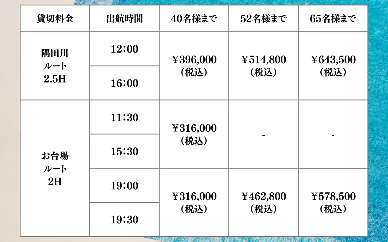※貸切料金については1艘あたりかかる金額となります。 |