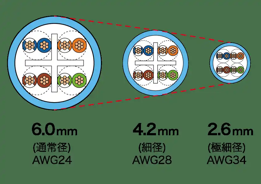AWG34の導体を採用することによって、標準的なAWG24のLANケーブルと比較して約57%の細径化を実現。 |