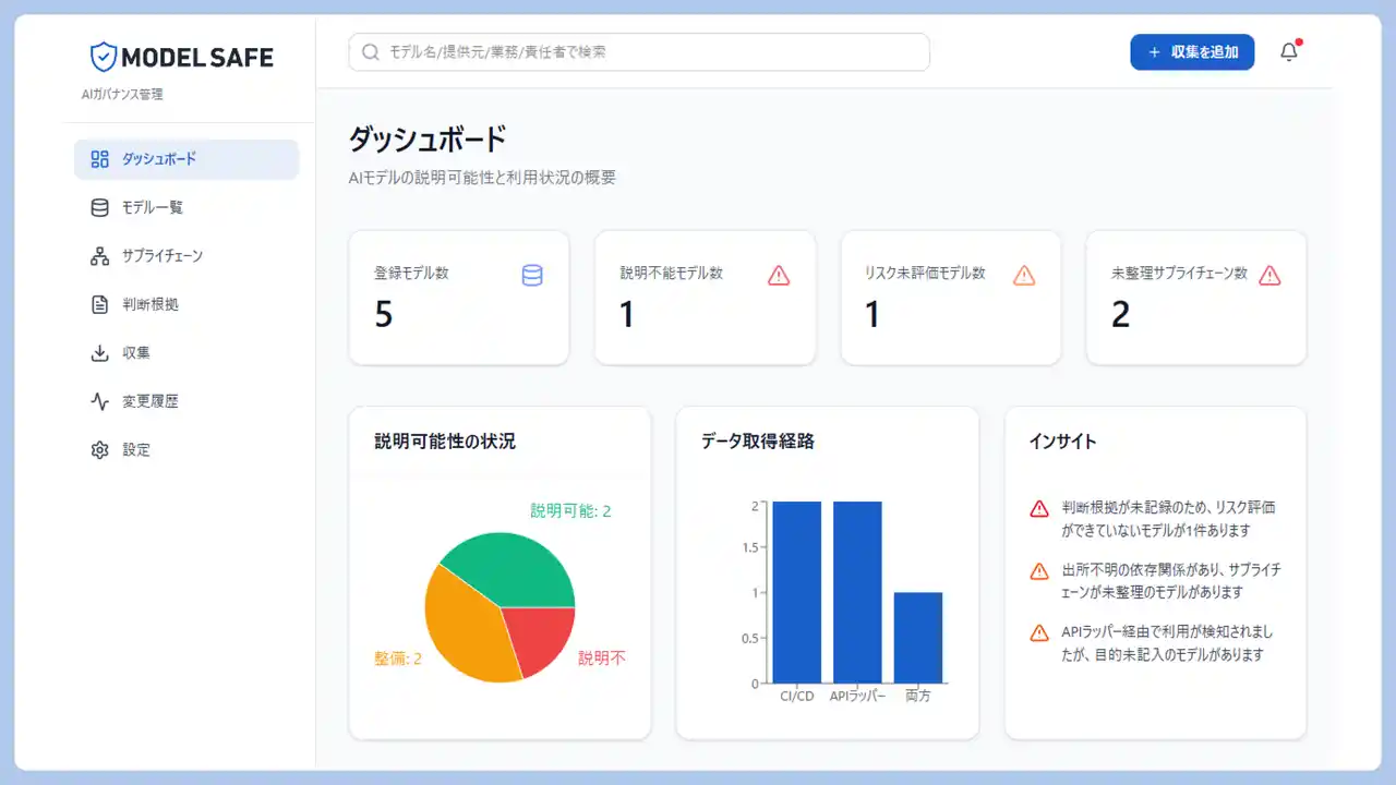 MODEL SAFEのβ版では、AIサプライチェーンにおけるリスクの中でも、導入直後から価値を実感しやすい領域にフォーカスした可視化機能を提供します。 |