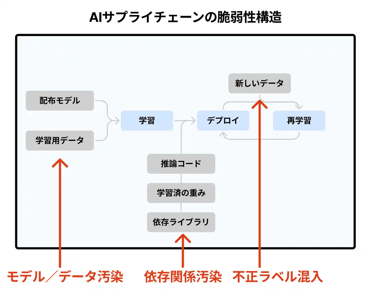 一方で、外部モデルや依存ライブラリといったAIを構成する要素に悪意あるコードが混入した場合、AIそのものが脆弱性となり、情報漏洩やサービス停止などの深刻な被害につながるリスクも存在します。 |