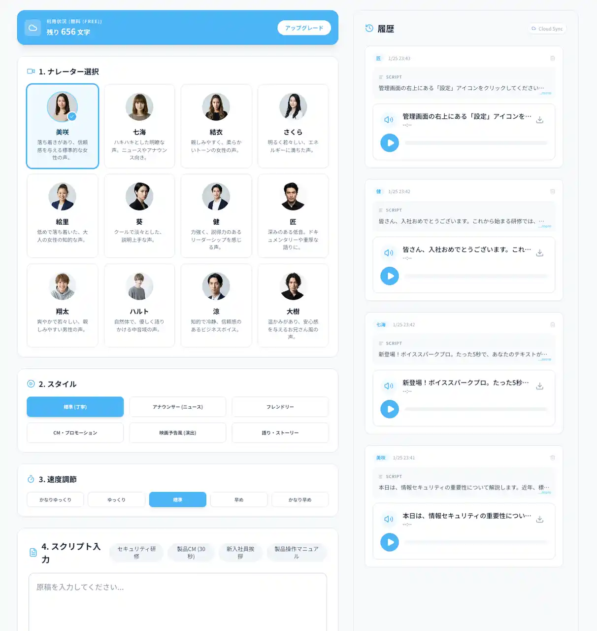 株式会社フランリベル(本社:東京都中央区、代表取締役:玉腰 和也)は、2026年1月27日(火)、Googleの最新AIモデル「Gemini 2.5 Pro TTS」を搭載した、次世代AIナレーション生成サービス『VoiceSpark(ボイススパーク)』を正式に提供開始いたしました。 |