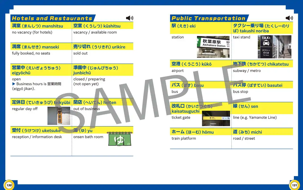「日本食の食べ物リスト」「街で見かける重要語リスト」など、観光客が困ったときに迷わず参照できるような、便利なリストを巻末に掲載しています。言葉が通じない場面でも、指でさし示したりパッと確認できる、旅の強い味方です。 |
