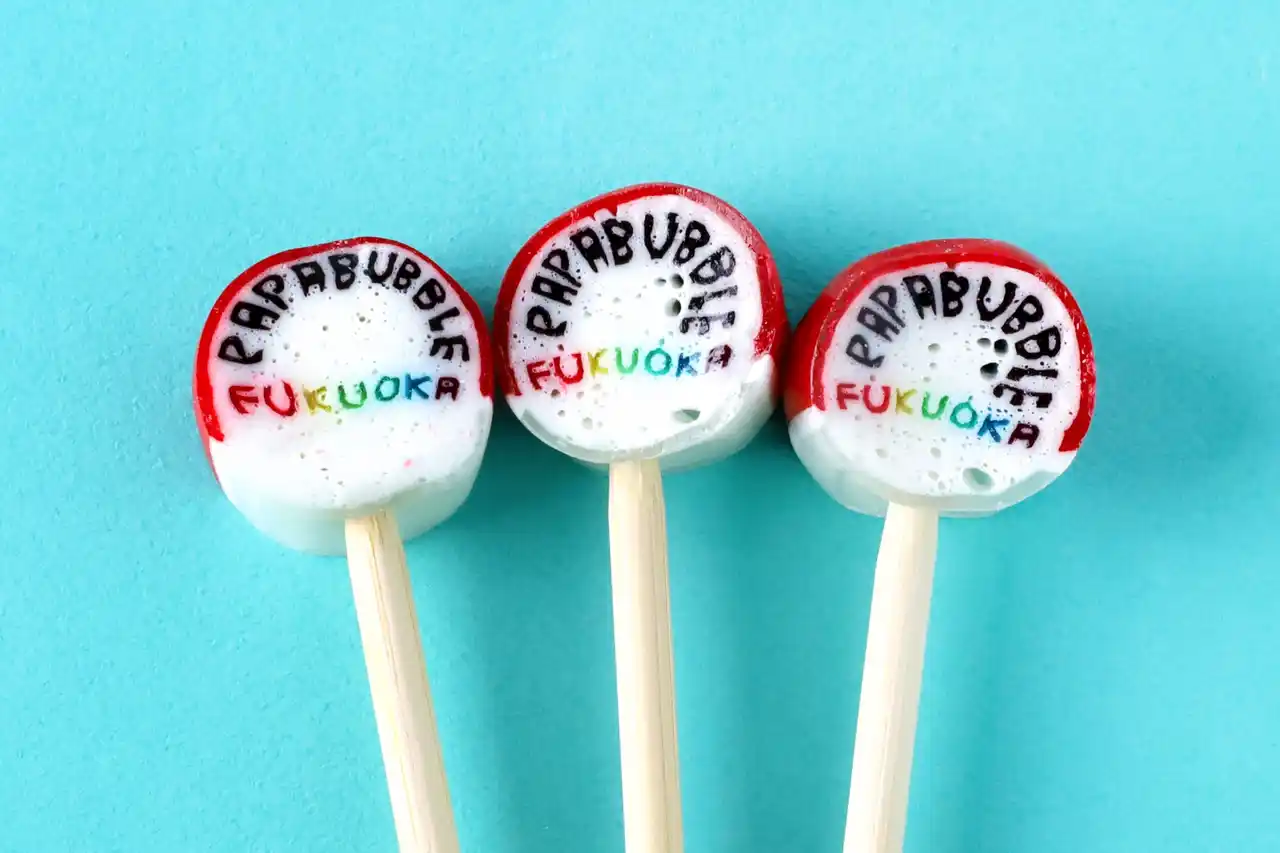 紅白を基調に「PAPABUBBLE」とレインボーカラーの「FUKUOKA」の文字を組み込んだ、高度な技術を要する特別デザイン。紅白のお祝いカラーで仕上げた、ここでしか手に入らないキャンディで一緒にお祝いください。 |