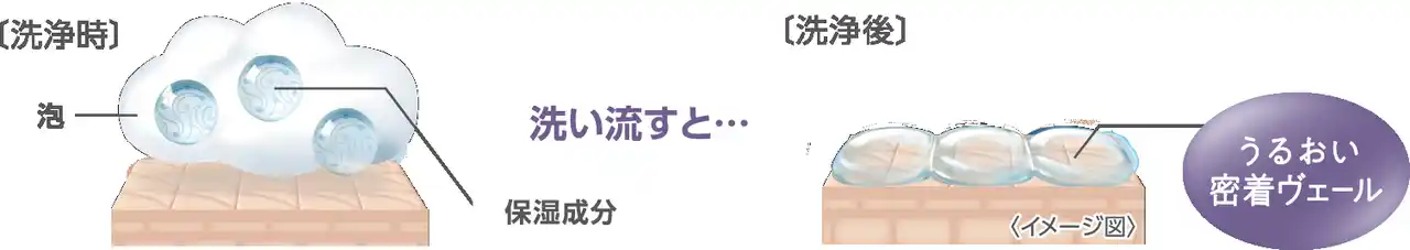 すすぎ時に保湿成分が肌に密着しやすいヴェールに変化し、洗うたび、なめらかでハリのある肌へ導きます。 |