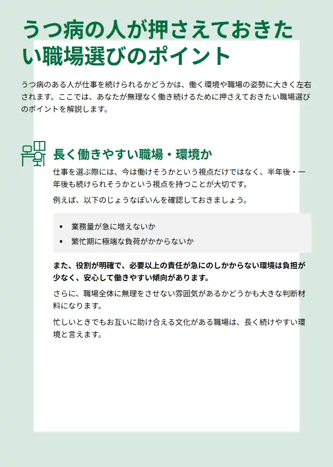 本資料では、うつ病と向き合いながら仕事を選ぶための考え方や、無理なく働ける条件の整理方法についてわかりやすく解説しています。