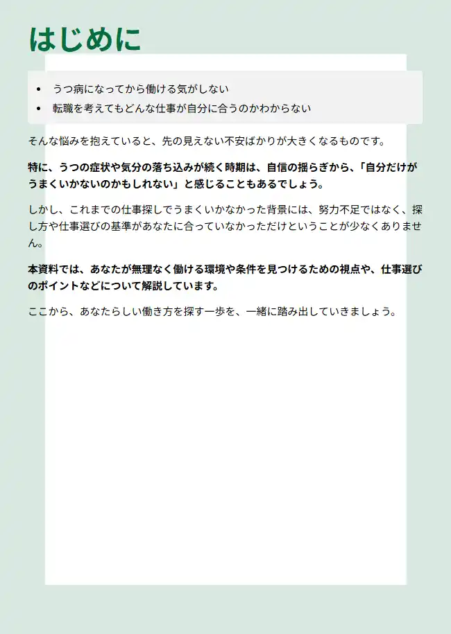 本資料では、うつ病と向き合いながら仕事を選ぶための考え方や、無理なく働ける条件の整理方法についてわかりやすく解説しています。 |