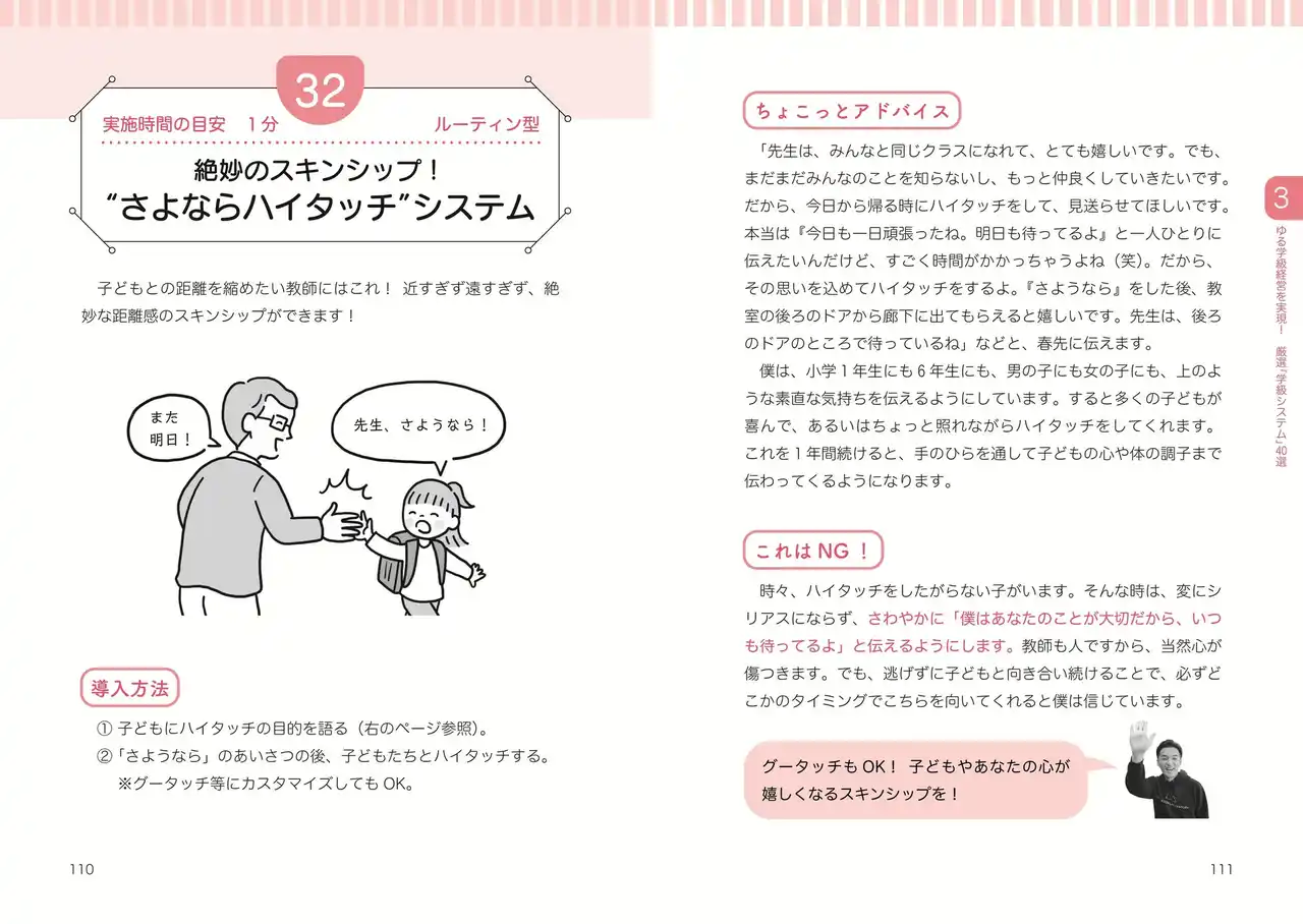 1 集中力アゲアゲ!“机といす、そろえる”システム 2 授業を定刻に開始できる!“日直タイマー”システム 3 スピードアップの切り札!“できた班から”システム 4 バイバイ、傷つく言葉!“ネガティブ発言封印”システム 5 学習のやる気アップ!“花丸カウント”システム 6 登校しぶりが改善!“朝にハッピー授業”システム 7 忘れ物対応、90%減!“レンタルボックス”システム 8 学習発表会で大成功!“YouTubeで練習”システム 9 リーダーが育つ!“班長ローテーション”システム 10 「気づいたらいない」を防ぐ!“トイレ連絡”システム 11 掲示物一枚で教室が整う!“写真でお手本”システム 12 教室に優しさ注入!“ポジティブ発言倍増”システム 13 “ほっ”とする朝!“黒板におはよう”システム 14 障害物があいさつを引き出す!“おはようボード”システム 15 宿題チェックのストレスから解放!“まだまだボックス”システム 16 朝からやる気みなぎる!“学級目標アファメーション”システム 17 学級目標達成への第一歩!“行動目標アファメーション”システム 18 個性が光る!“個人目標アファメーション”システム 19 いなくたって「大事な仲間」!“欠席者名コール”システム 20 ハンカチ所持率100%!“ついでにハンカチチェック”システム 21 パニックを防ぐ!“変更は朝に連絡”システム 22 きれいに並べる魔法の言葉!“まっすぐ整列”システム 23 全ての子に居場所がある!“列は詰めない”システム 24 給食準備時間を短縮!“給食リーダー”システム 25 時間に遅れない給食準備!“給食タイマー”システム 26 給食当番が瞬時に並べる!“整列シール”システム 27 公平な食事量が実現!“給食減らし・増やし”システム 28 食器、ピッカピカ!“お皿チェック”システム 29 支援漏れを防ぐ!“自ら個別最適宿題”システム 30 3 分で完了!“帰りの準備BGM”システム 31 苦情対応が激減!“帰りの会では叱らない”システム 32 絶妙のスキンシップ!“さよならハイタッチ”システム 33 忘れ物を一掃!“持ち物は3 日前”システム 34 ハートに火をつける!“係活動、(月)朝”システム 35 最後まで授業に集中!“展開見える化”システム 36 ノートづくり名人、続々!“お手本ノート配布”システム 37 長期休業前の流儀!“ 1 日1 個持ち帰る”システム 38 出張中のトラブル防止!“一授業一約束”システム 39 うっかり忘れを回避!“誕生日カレンダー”システム 40 革命的時短術!“学級通信ボイスライティング”システム |