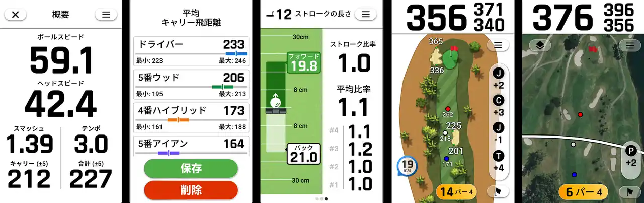 左から、スイング計測、クラブマッピング、パッティングトレーニング、ゴルフナビ画面、航空写真表示 |