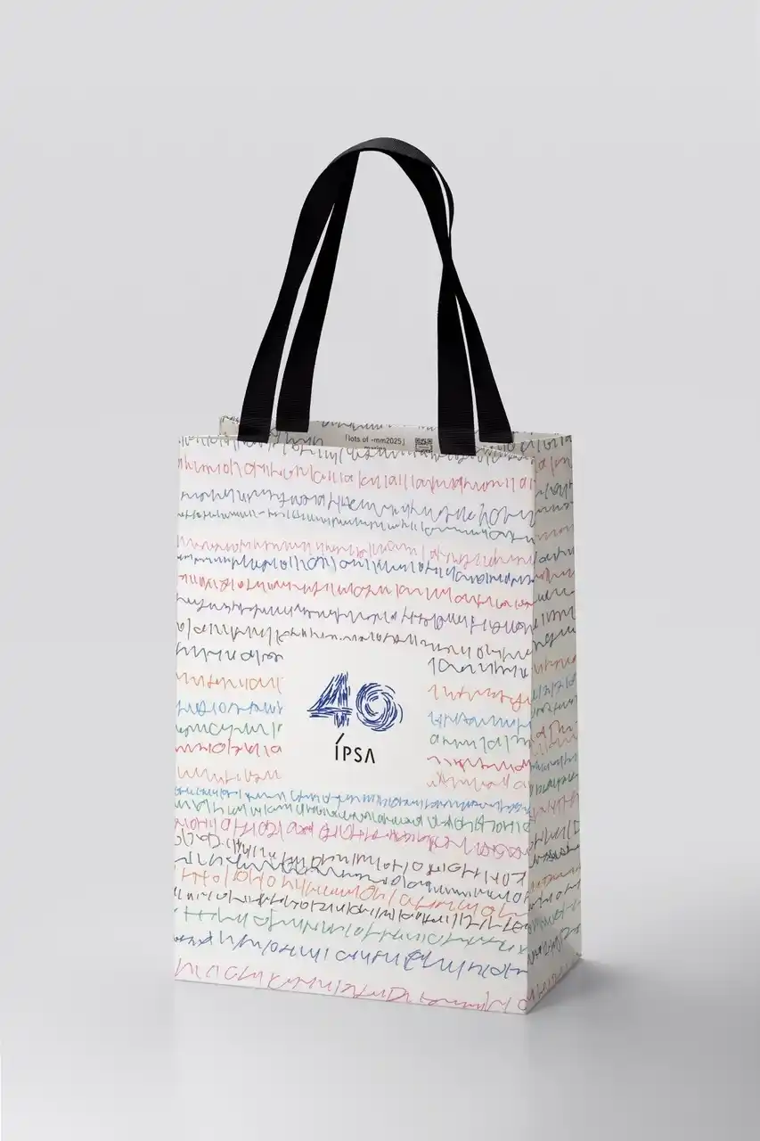marina氏の代表的作品であるタイポグラフィアートとイプサ40周年ロゴがプリントされた紙製の限定ショッピングバッグ。2月5日(木)よりイプサ製品を店頭でお買い上げいただいたお客さまに数量限定で配布いたします。 |