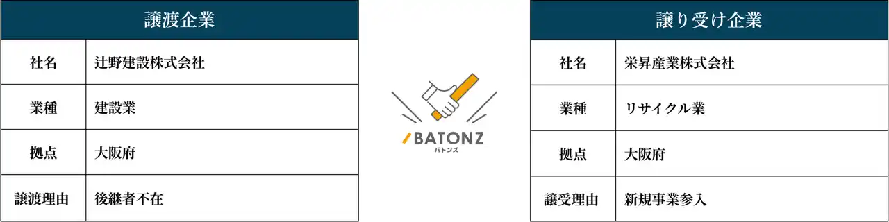 M&A・事業承継支援プラットフォーム「BATONZ(バトンズ)」を運営する株式会社バトンズ(本社:東京都中央区、代表取締役CEO:神瀬悠一、以下バトンズ)は、大阪信用金庫(本店:大阪府大阪市天王寺区、理事長:高井嘉津義)、大阪府事業承継・引継ぎ支援センター(所在地:大阪府大阪市中央区、統括責任者:兼田亜貴)と連携して、栄昇産業株式会社(本社:大阪府八尾市、以下栄昇産業)と辻野建設株式会社(本社:大阪府泉南市、以下辻野建設)のM&A成約を支援したことをお知らせします。 |
