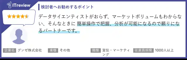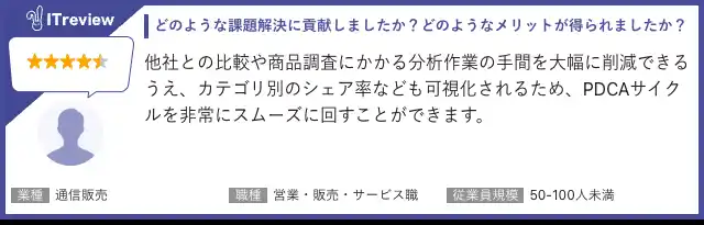 レビューでは、「商品開発」「販売商品の選定・仕入れ」「販売施策」などさまざまなシーンの中で合理的な判断をするにあたり欠かせないツールとしてご活用いただいているとのお声を多数いただいています。 |