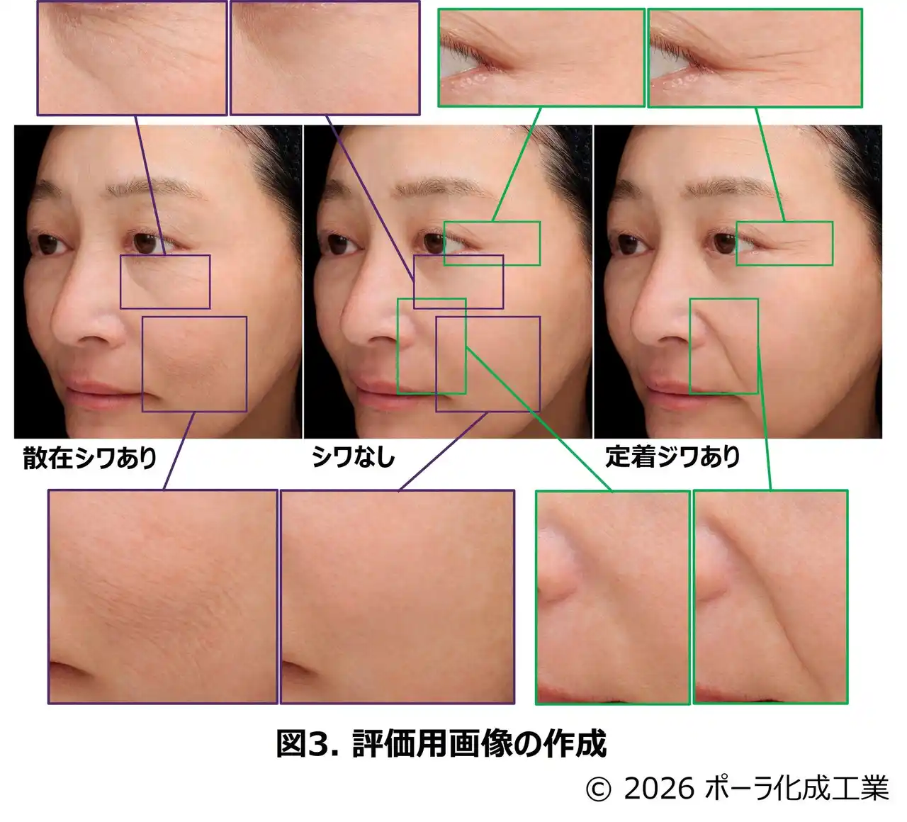 評価用画像は、数人の顔画像から架空の人物画像を“シワなし”画像として作成し、それをベースに散在シワを付与した“散在シワあり”、定着ジワを付与した”定着ジワあり”の画像を作成しました(図3)。各シワには実在の人物より抽出したシワを使用しました。シワ以外の影響を除外するため、シミや毛穴などのその他の肌の要素を除去しました。 |