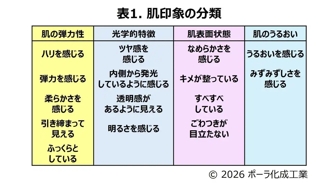 徴」に関する 4 印象、「肌表面状態」に関する 4 印象、「肌のうるおい」に関する 2 印象に分類し、それぞれの分類での平均点を求めました(表 1)。 |