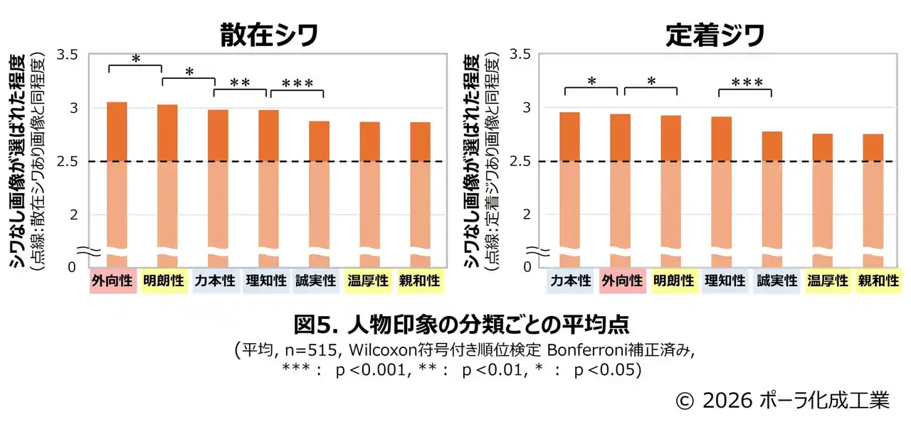 以上の結果から、人物印象においても、散在シワと定着ジワでは、それぞれが目立たなくなった場合に人物印象に与える影響が異なることが示唆されました。 |