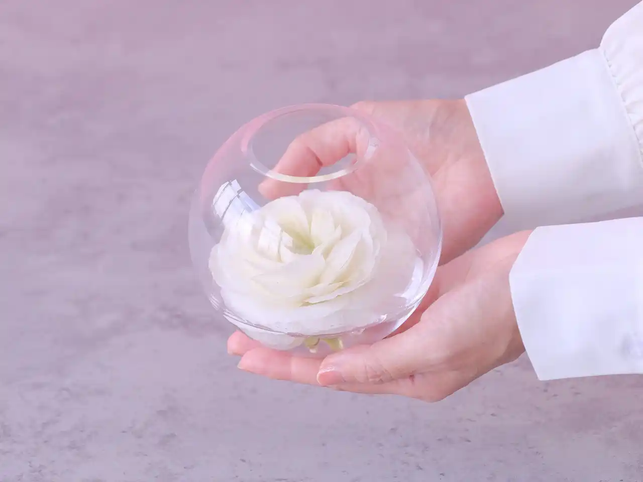 丸い花瓶に花首だけを浮かべました。ラナンキュラスは花の重さで茎が折れてしまう場合があります。そんなときにもおすすめの飾り方です。 |