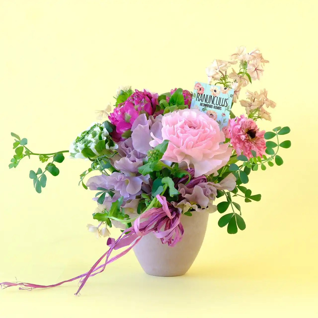 ショップおすすめのラナンキュラスをナチュラルなアレンジメントに仕上げました。器付きでそのまま飾って楽しめます。 |