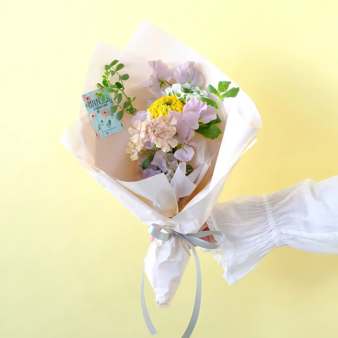 ショップおすすめのラナンキュラスをシンプルなブーケに仕上げました。コンパクトなサイズでちょっとしたギフトやご自宅用にもおすすめです。 |