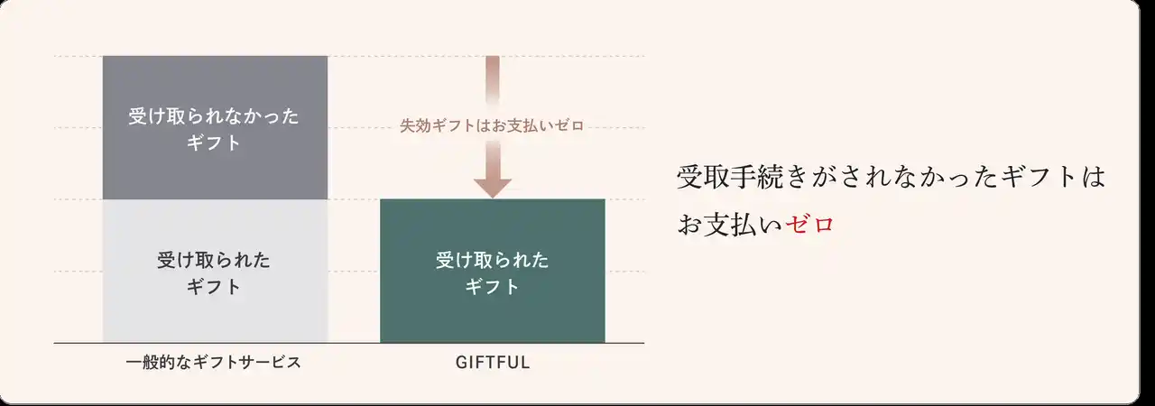 「実際に受け取られたギフト」にのみお支払い。受取手続きが行われず期限切れとなった場合、商品代金や発行手数料は一切かかりません。未受領ギフト・失効ギフトにも支払いが発生する一般的なデジタルギフトとは異なり、“ギフトと想いが届いた分だけのお支払い”というフェアで誠実な料金設計を大切にしています。 |