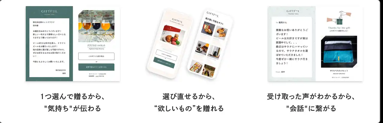 オンライン送付、手渡し、商品を直接お届けなど多様な送り方をワンプラットフォームで提供し、お相手やシーンに最適な形でギフトを届けられます。 |