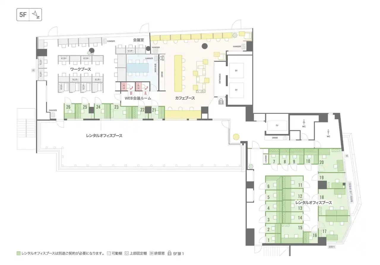 設備:Wi-Fi、フリードリンク、無料プリンター、ロッカー、ポスト、登記可、会議室、WEB会議ルーム |