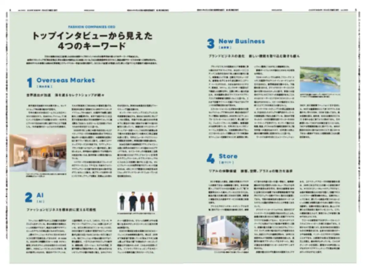 それぞれの経営トップが語ったコメントを見てみると、「海外市場」「デジタル・AI」「新事業」「店づくり」「人材育成」といったキーワードが並びます。成長のフロンティアを「海外市場」に求める動きが例年以上に加速しています。「AI」は業務効率化だけでなく、商品企画やサービスの中枢へと活用が広がっています。既存の事業とは異なる「新事業」でブレイクスルーを狙う企業も相次いでいます。EC(ネット通販)が浸透した今、新しい「店づくり」を模索する動きも活発です。また、そうした拡大路線の一方で、その基盤を支える「人材育成」に注力する企業も目立ちました。 |