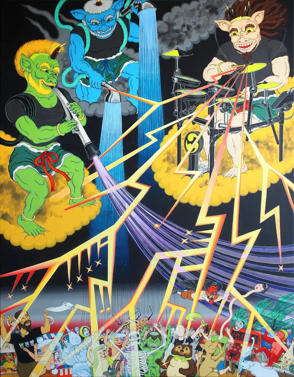 人間のルールに縛られない妖怪たちが、音楽フェスで自由に盛り上がる姿を描いた作品です。夏の天気のように気ままで予測不能なエネルギーと、現代社会の混沌とした空気感の中でも楽しむ心を重ね、風神雷神になぞらえて表現しました。 |