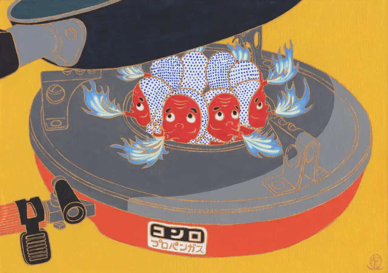 竈(かまど)の神様であるという説もあり、自身のアーティストネームとしても思い入れの強いモチーフの「ひょっとこ」が現代の竈としてのガスコンロに宿っている様子を描いた作品です。 |