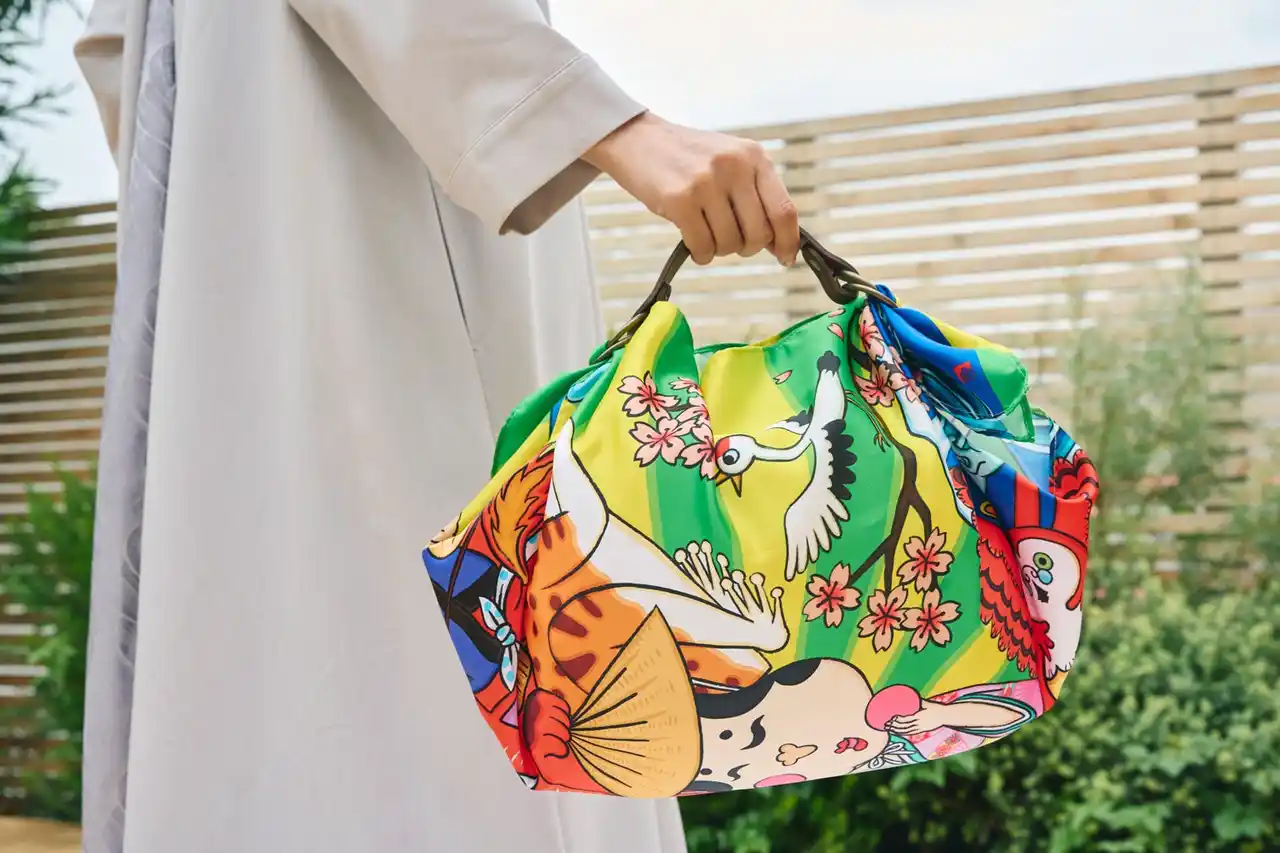 撥水加工を施した風呂敷は、結んだり持ち手を付けたりすることで、バッグとしても使えます。 |