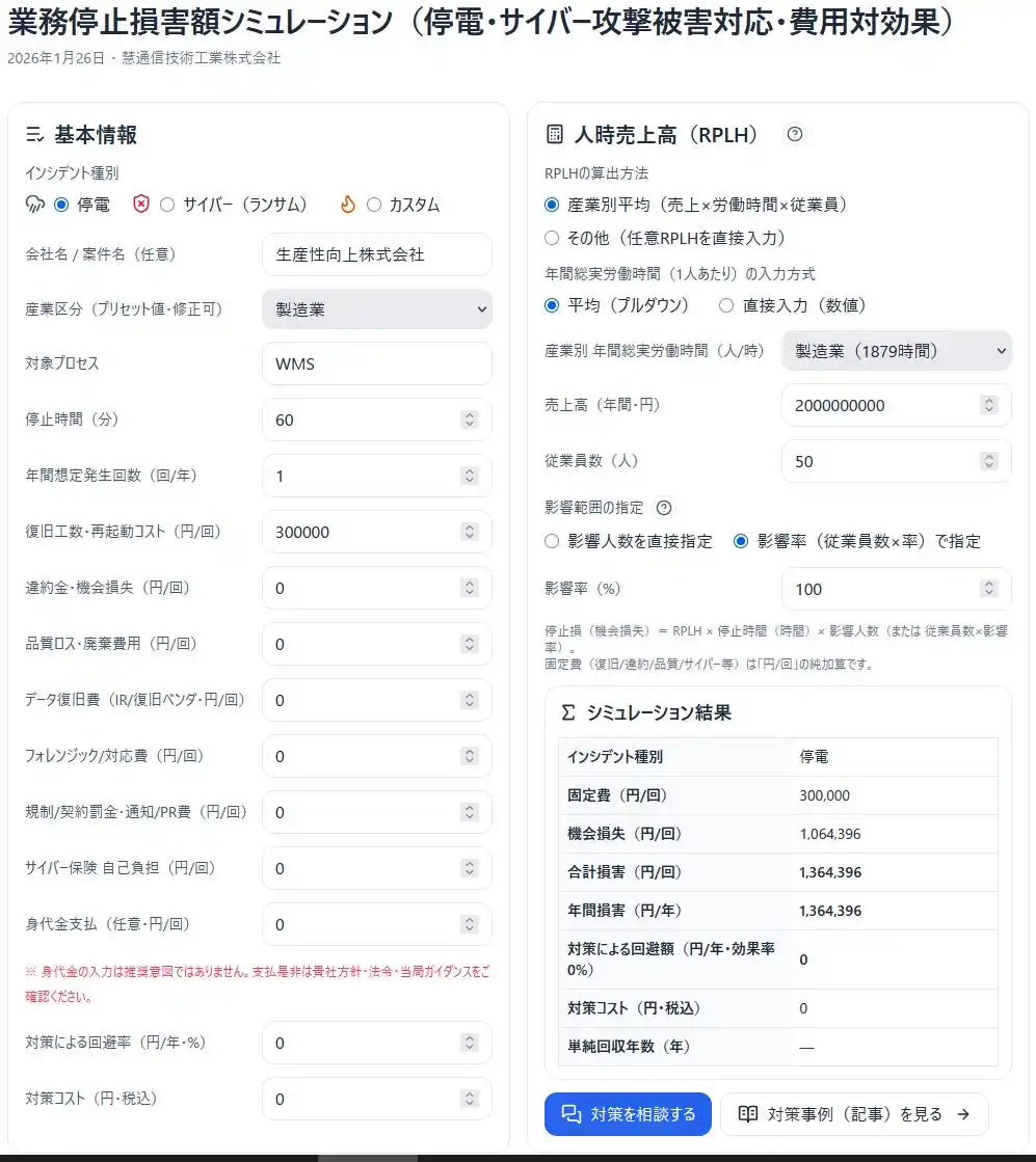 | 製造業・物流業での試算例 ──「1時間止まるだけ」で何が起きるか | ||||||||||||