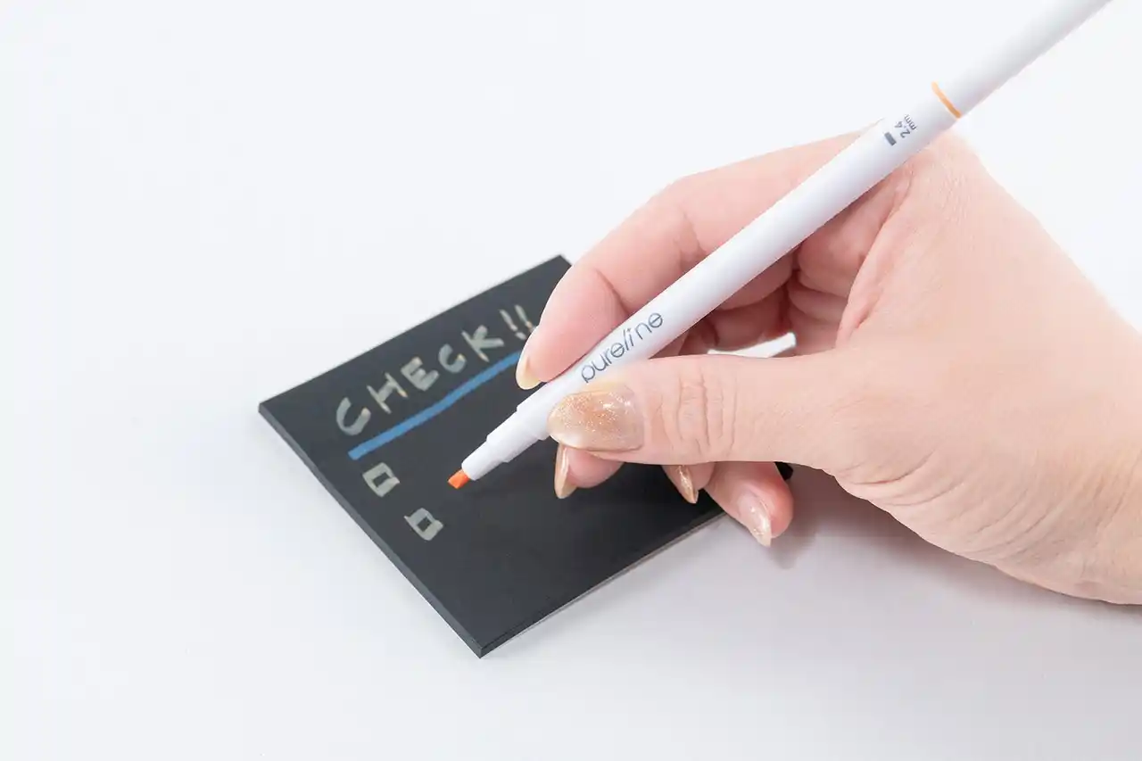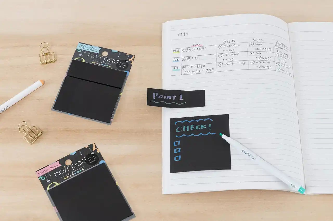 本製品に使用されているインキは水性顔料インキで隠ぺい性のある特殊な材料を使用しているため、黒い用紙にも書け、時間の経過とともに徐々にきれいに発色します。 また筆跡のにじみが少なく、裏写りや裏ぬけがしづらく、書いた内容をきれいにまとめることができます。同シリーズの黒い付箋のノアールパッドとピュアラインのセット使いもおすすめです。 |