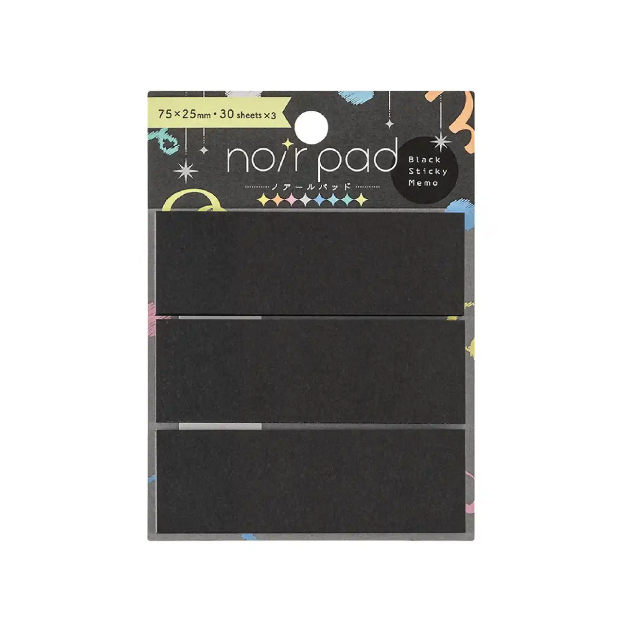 ノアールパッドは色上質紙の黒い用紙の付箋なので裏面まで黒く、ノートに貼ったときにも目を引くアイテムです。 75×75mmの1ピース、75×50mmと75×25mm2サイズで使い分けできる2ピース、25×25mmと細長いサイズでたっぷり90枚の3ピースの3サイズを展開。用途に合わせて使い分けが可能です。 |