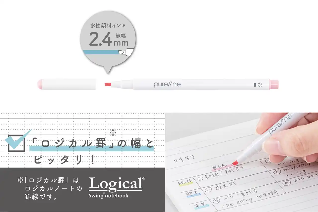 ピュアラインはスリムな線幅のラインマーカーです。一般的なラインマーカーの線幅が4mmに対して本製品は2.4mmと細く、ペンケースに収納してもかさ張りにくく持ち運びに便利です。 またこの線幅は当社製品ロジカルノートやロジカルダイアリーに使用されているロジカル罫の罫幅にもあうようになっています。 |