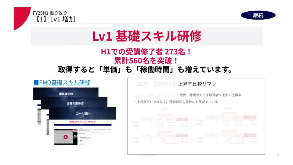 カリキュラム受講前後や、受講者と非受講者を比較したところ、一人当たりの売上単価(人月単価)や、取引先企業の支援機会が増加していることが判明。マーケットバリューの向上という結果を社内へ公開 |