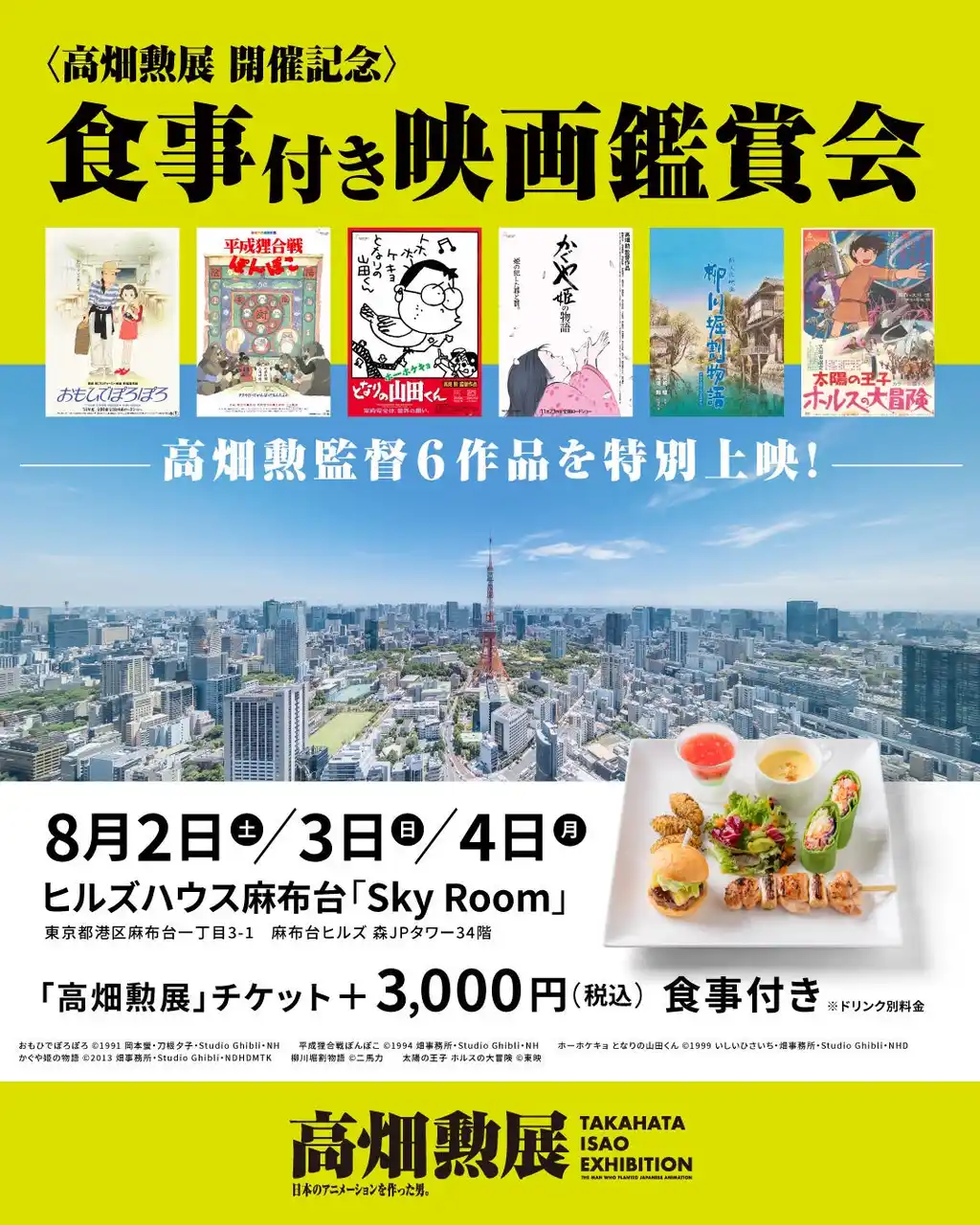展覧会と食事付き映画観賞会がセットになったチケットを発売します。高畑勲監督作品6作品を特別上映、映画鑑賞後に三國シェフ監修のお食事をご提供します。34階からの東京の景色とともにお楽しみください。 |