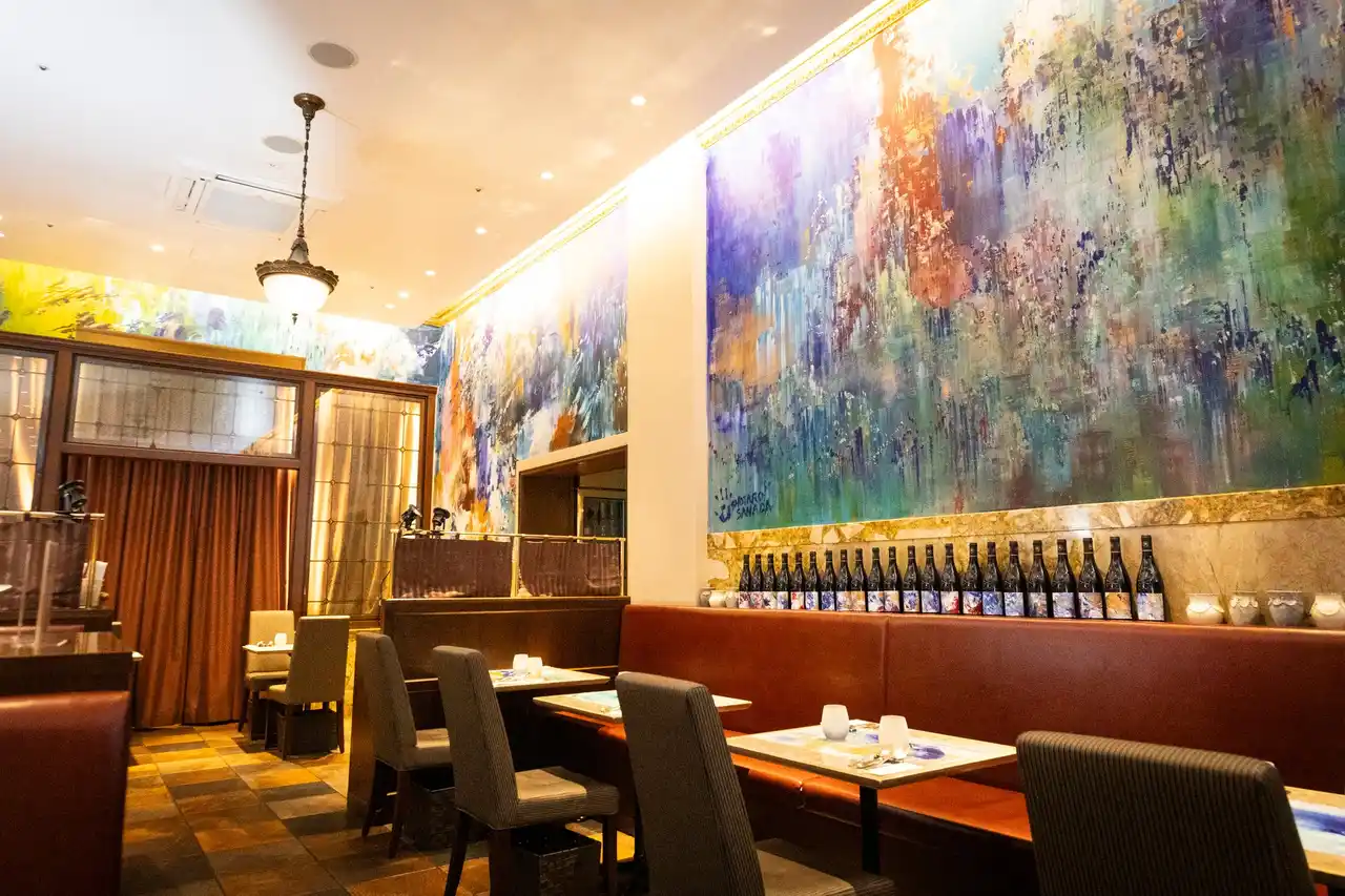 店内は、画家・真田将太朗の壁画に包まれたエリアと、戦前、皇族や政府要人が列車を待つために使われていた貴賓室を改装したエリアが共存しています。趣の異なるそれぞれの空間で、肩肘張らずにワインと食事を楽しめるのも、このレストランならではの魅力です。 |