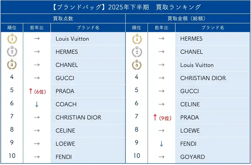 プラダは日本国内の相場が高く、海外から持ち込まれるケースが増えたことから、点数・金額ともにランクアップしたと考えられます。 |