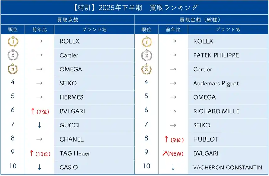 ブルガリは、買取点数が7位から6位にランクアップしたことが金額にも影響し、前年圏外からトップ10にランクインしています。また、2025年上半期と比較しても、高単価の持ち込みが増えました。買取相場が最も上がったのはロレックスで、順位は変わらず1位ですが、内訳として、前年から今年にかけて買取の平均単価が35%以上も上昇しています。 |