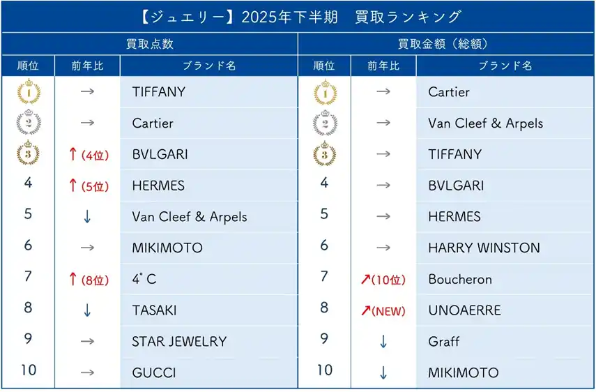 点数では、1位「ティファニー」、2位「カルティエ」、3位「ブルガリ」となりました。金額では、1位「カルティエ」、2位「ヴァンクリーフ&アーペル」、3位「ティファニー」と前年と変わらない結果となりました。 |