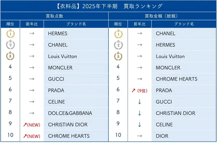 点数では、1位「エルメス」、2位「シャネル」、3位「ルイ・ヴィトン」という不動の結果となりました。変化があったのは、9位、10位。「クリスチャンディオール」と「クロムハーツ」がランクイン。金額では、1位「シャネル」、2位「エルメス」、3位「ルイ・ヴィトン」となりました。 |