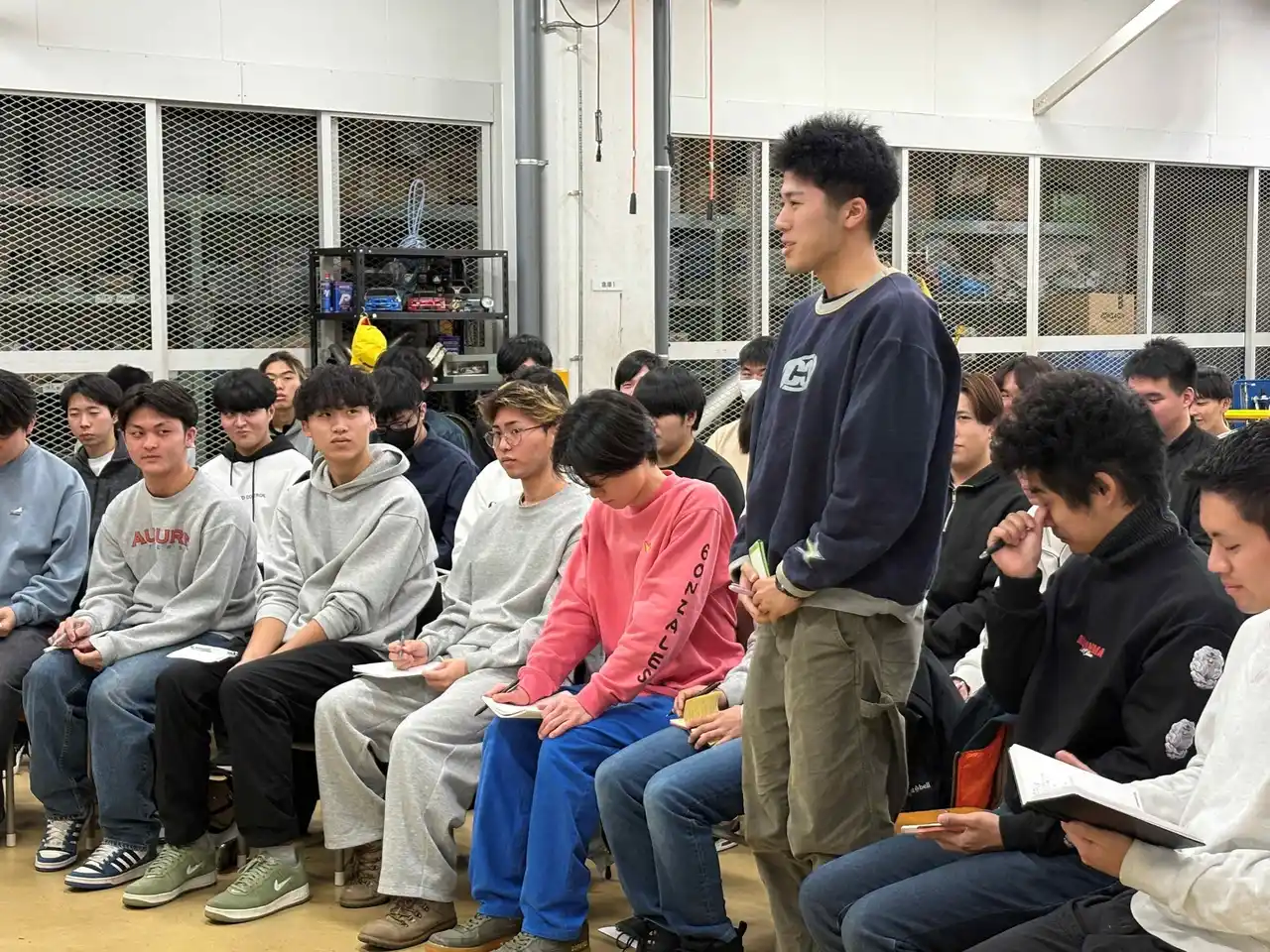 片岡選手から「日々の練習を毎回分析していますか」「自分が走りたい走行のイメージはできますか」「メカニックやレース関係者に感謝の想いをもっていますか」という投げかけに真剣な表情を見せる学生。大事な話はメモを取り、一人ひとりが「学び」に繋げていました。授業の終盤では、来季から公式レースへの参戦を控える学生から「初見のサーキットの攻略法」など具体的な悩みが寄せられました。 |