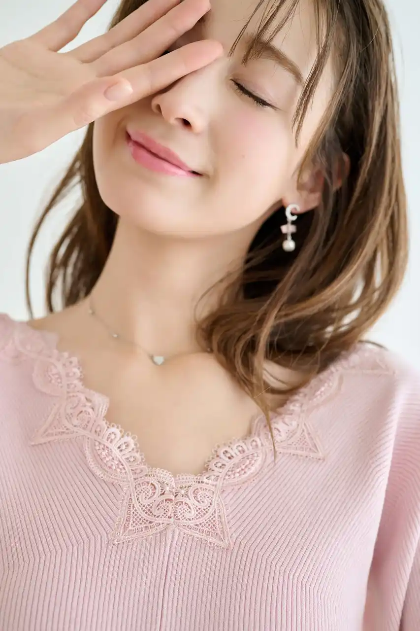 バレンタインシーズンに映えるショルダーフリルが印象的なブラウス。衿ぐりには、ハートモチーフを忍ばせたテープレースをあしらい、近くでこそ伝わる遊び心を。 |