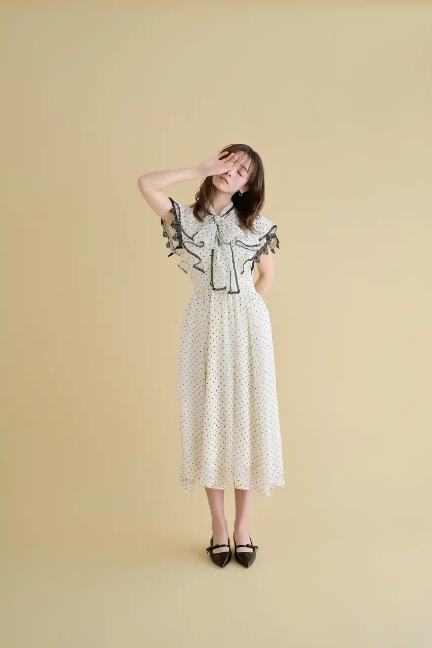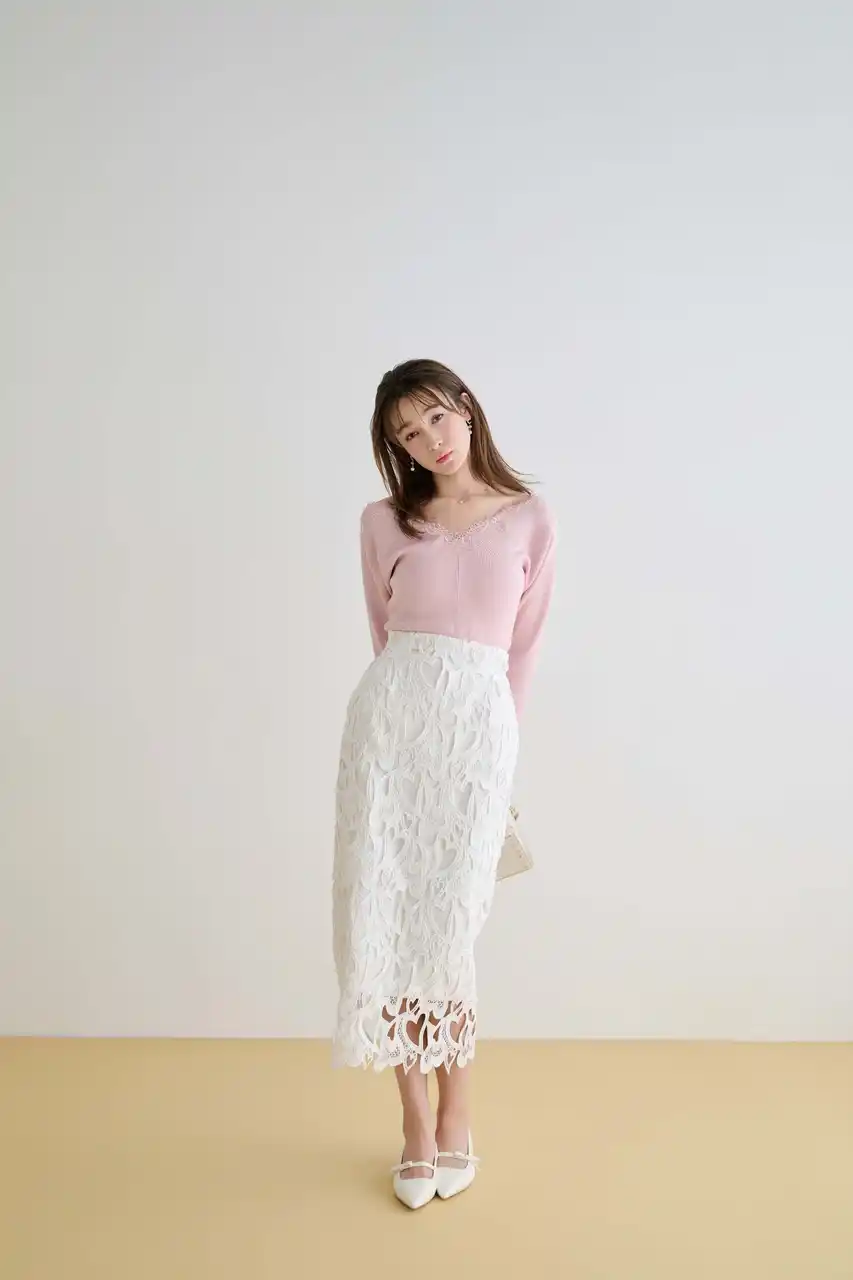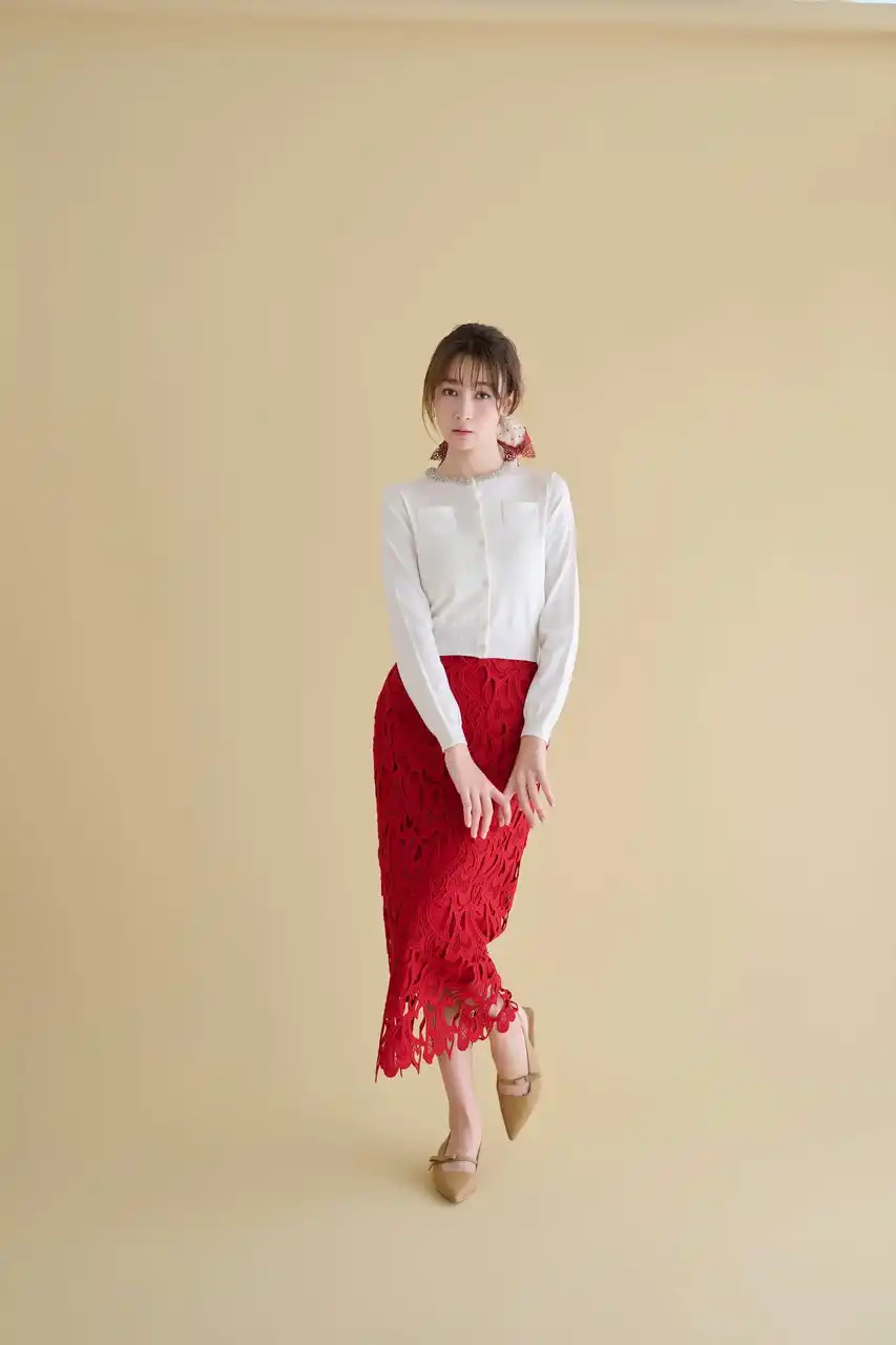オリジナルのハート柄は、抜け感と繊細さを計算。歩くたびに表情を変えるヘムラインが、装いに奥行きを与えます。ビジュー付きカーディガンを合わせて、アクセサリーに頼らない完成度へ。 |
