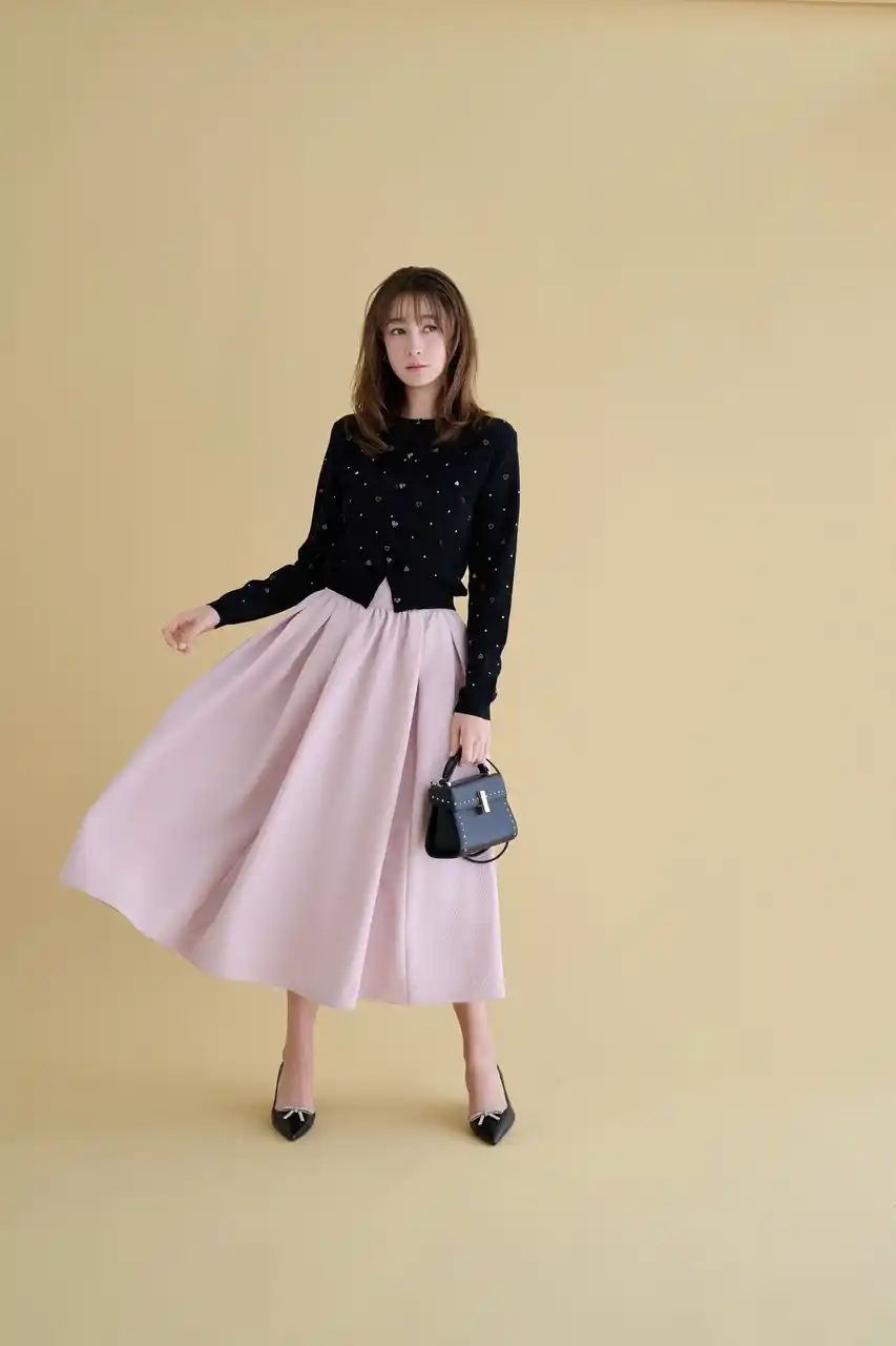 ハート刺繍を散りばめたカーディガンを主役に、程よく大胆なボリュームスカートを合わせて、印象は一気にモードへ。フロントに並ぶハートボタンが、視線を集めるアクセントに。 |