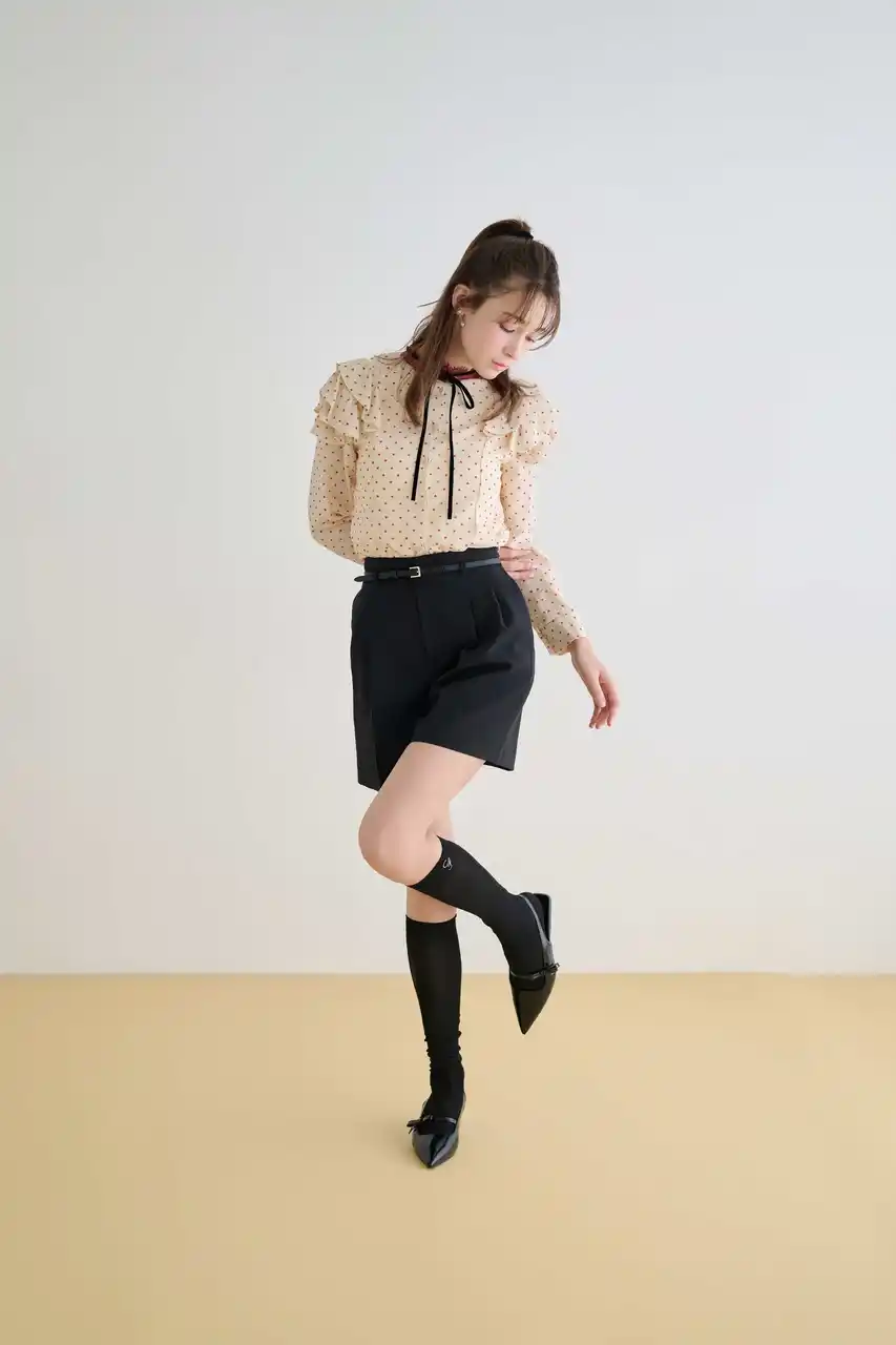トレンドのポルカドットに、ハートを織り交ぜたプリント。視線を惹きつけながらも、大きさを抑えたドットが着こなしやすさを叶えます。レザーライクジャケット合わせで、デイリーにも映える一着に。 |