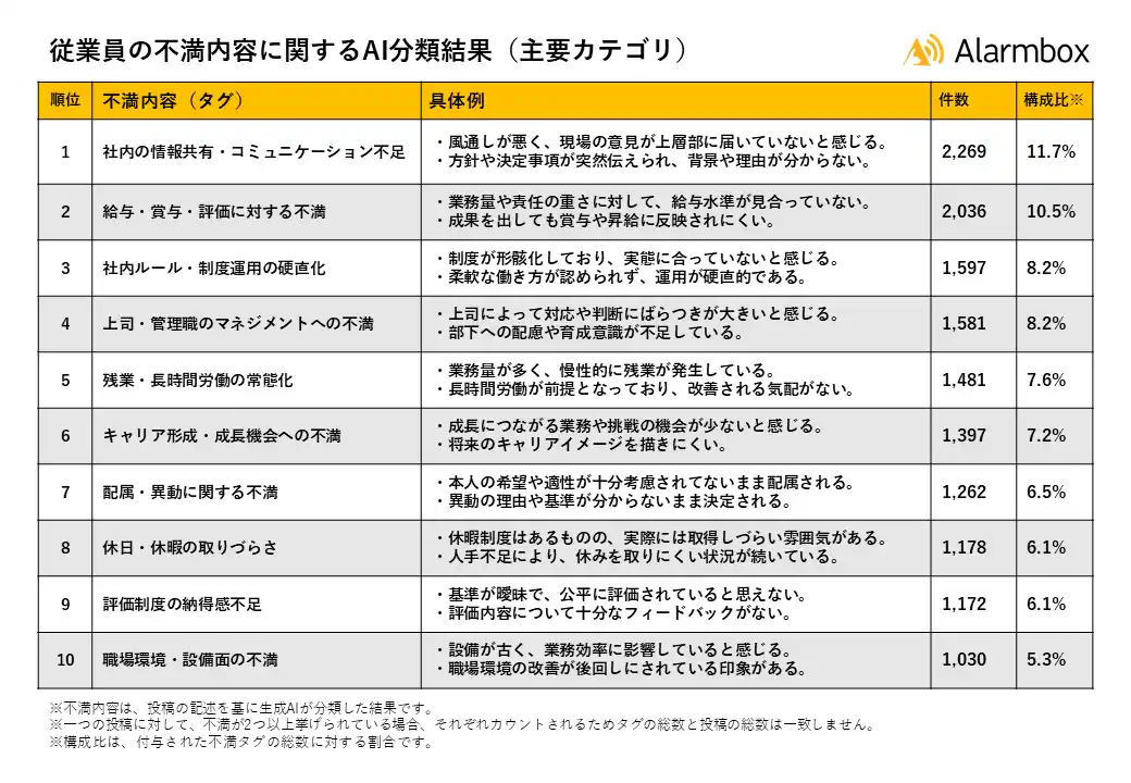 2025年に投稿された従業員の不満投稿について、生成AIを用いて内容をカテゴリ別に分類しました。その結果、「社内の情報共有や意思疎通が不十分である」といった組織内コミュニケーションへの不満をはじめ、給与・賞与など賃金への不満、現状に合っていないルールや制度などが、主要な不満内容として確認されました。 |