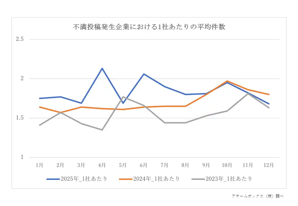 なお、2025年の推移を見ると、4月時点においても1社あたりの不満投稿件数が過去2年と比べて高い水準にありました。年度初期は比較的投稿量が落ち着く傾向も見られますが、特に2025年は、年内の月別比較においても4月の1社あたり件数が相対的に高く、新年度開始直後の段階から投稿密度が高い状態で推移していました。 |